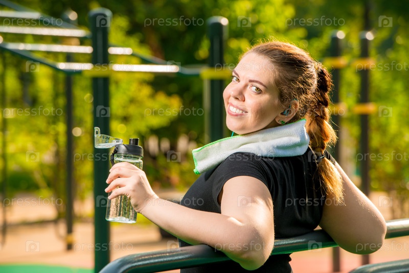 Девушка по размеру после тренировки отдыхает, работайте над концептом своего тела