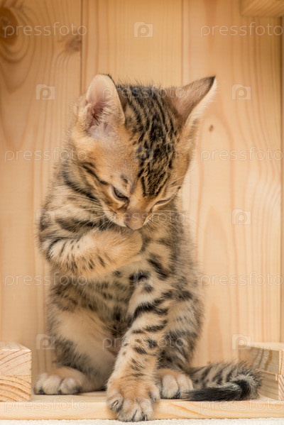 Вертикальный портрет бенгальской породы котенка в деревянном ящике