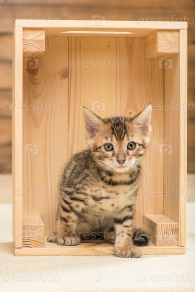 Чистокровный котенок, сидящий в деревянном ящике, портрет крупным планом