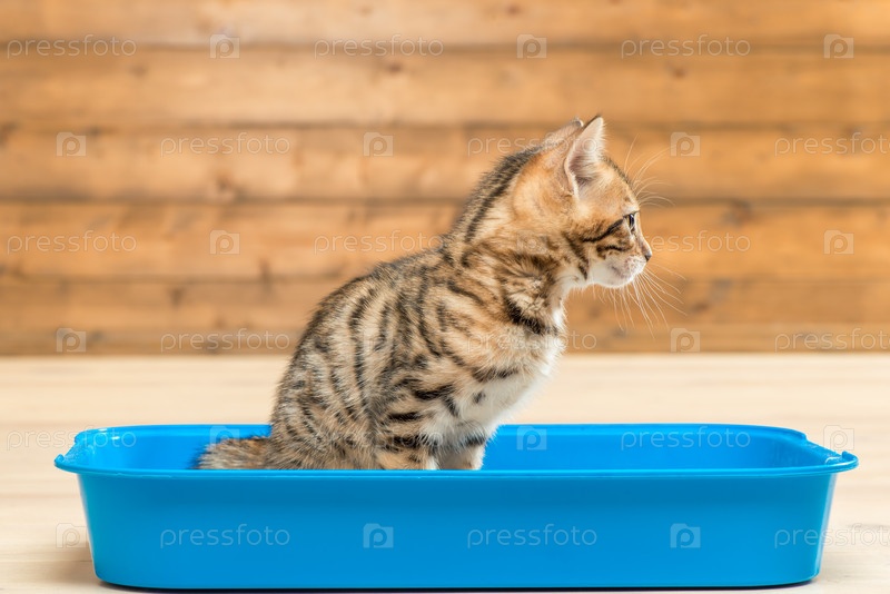 Котенок, сосредоточенный на процессе, сидит на туалетном подносе