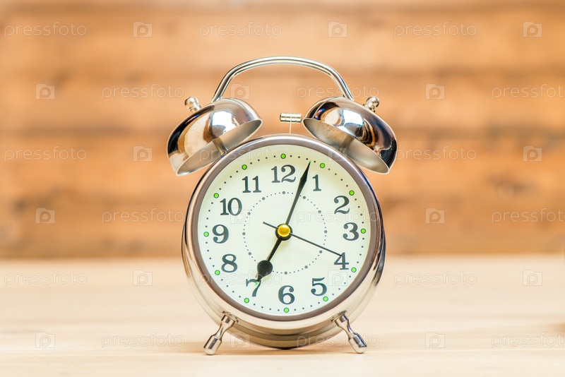 Серебряный будильник в стиле ретро на деревянном фоне крупным планом показывает 7 утра