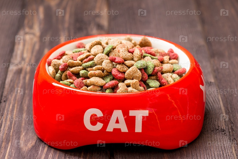 Крупный план краснокошачья миска с сухой пищей на полу дома