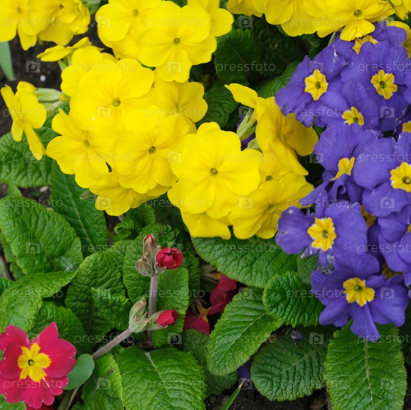 Яркие фиолетовые, желтые и малиновые примулы (Primula vulgaris) в естественной обстановке сада, дневная фотография