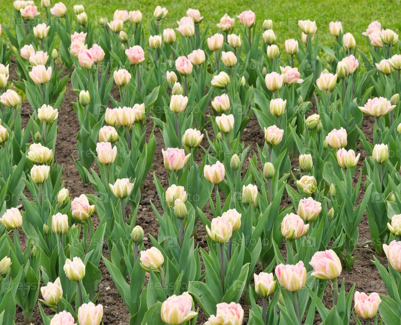 Нежные бело-розовые тюльпаны в ряды, весенние садовые ряды, мягкий естественный свет, цветочное поле фон