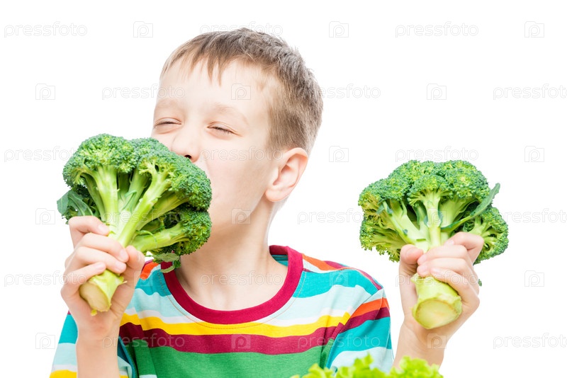 Вегетарианский мальчик с брокколи на белом фоне, портрет изолирован