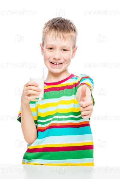 Счастливый здоровый ребенок со стаканом молока на белом фоне