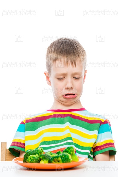 Мальчик с отвращением смотрит на тарелку брокколи, портрет на белом фоне изолирован