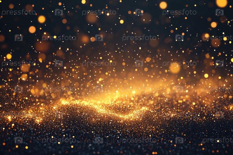 Золотистые мерцающие частицы создают волшебную атмосферу с мягким эффектом боке, освещая темный фон и усиливая очаровательный визуальный опыт света и текстуры