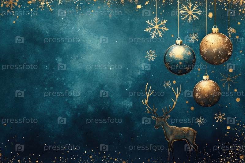 Праздничная иллюстрация демонстрирует северного оленя рядом с висящими украшениями и снежинками, расположенными на богатом синем фоне, создавая волшебную зимнюю атмосферу, идеально подходящую для праздничных тем