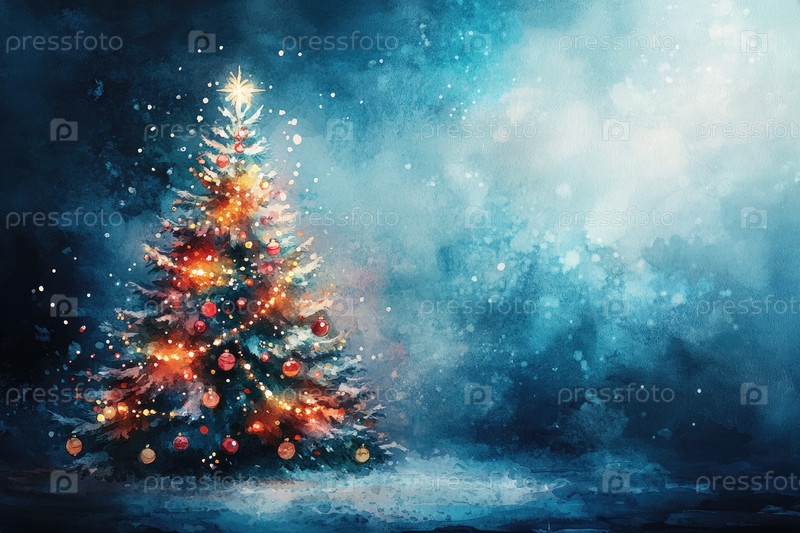 Праздничная рождественская елка, украшенная яркими украшениями и мерцающими огнями, стоит в безмятежном зимнем пейзаже, окруженном мягким снегом и мечтательной голубой атмосферой, вызывая праздничное настроение