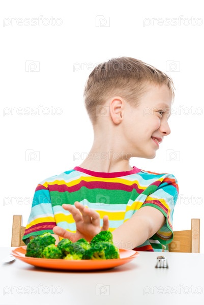 Мальчик передвигает тарелку с безвкусной брокколи, портрет на белом фоне изолирован
