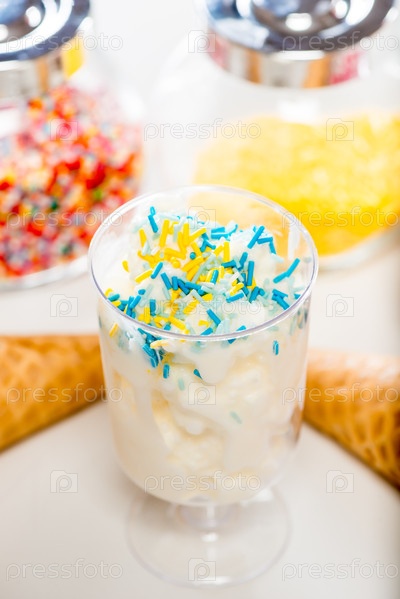 Закрытие стакана со сливочным мороженым и декоративной посыпкой