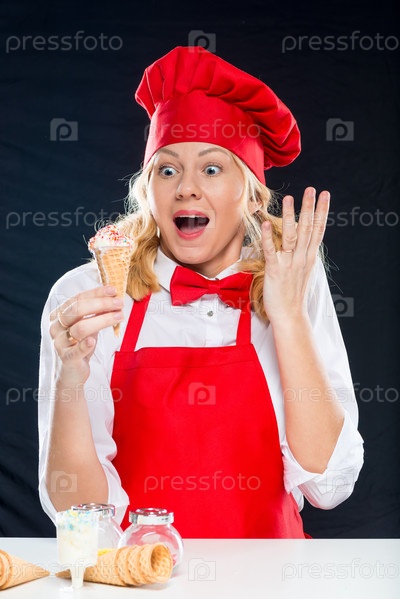 Портрет сумасшедшего и удивленного шеф-повара с мороженым в вафельной чашке