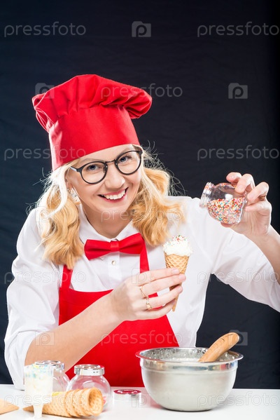 Счастливый шеф-повар с мороженым в вафельном роге, делает декор