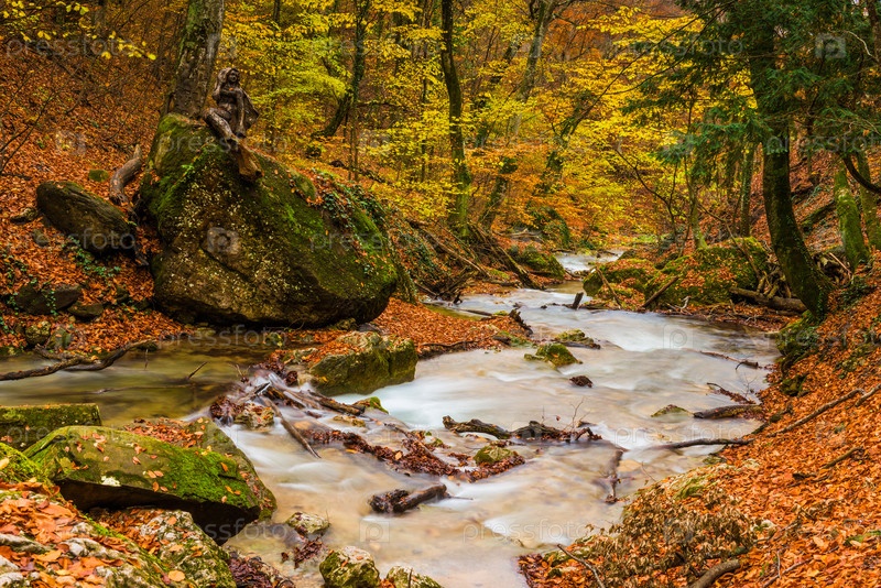 Живописное осеннее ущелье с рекой, протекающей между камнями, природа Крыма, Россия