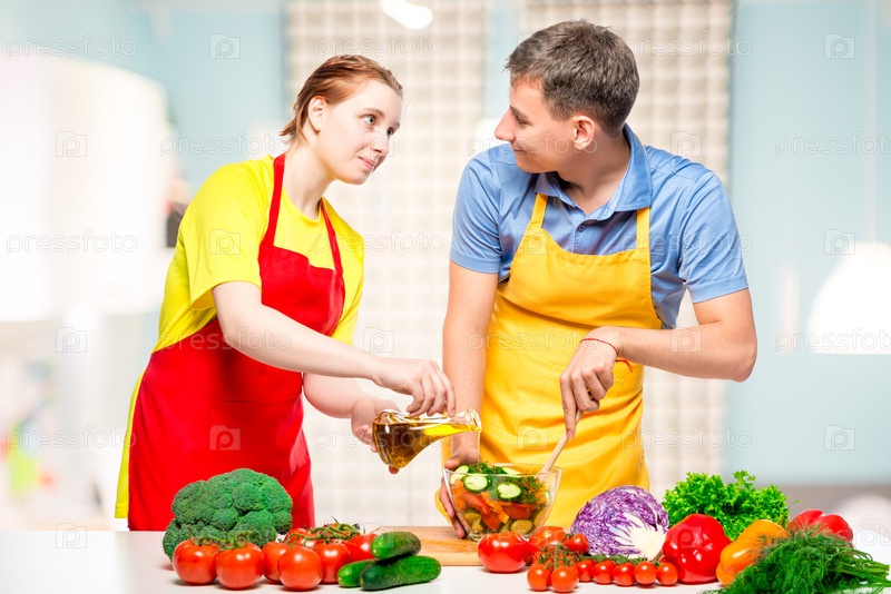 Девушка наливает салат оливковым маслом, семья во время готовки на кухне