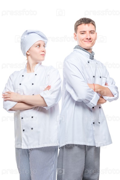 Вертикальный портрет успешной команды профессиональных поваров в костюмах на белом фоне