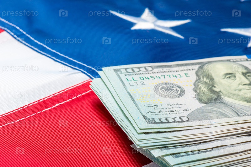 Вид стопки денег, лежащих на флаге Соединенных Штатов Америки крупным планом