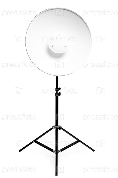 Круглая металлическая фотовспышка на стойке в фотостудии на белом фоне крупным планом