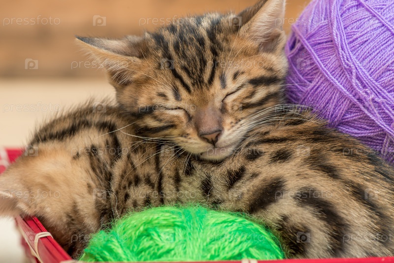 Спящие бенгальские котята с шариками ниток крупным планом