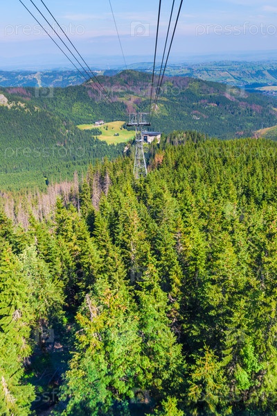 Фуникулерная прогулка по лесу в горах, красивый пейзаж