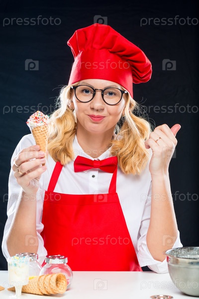 Улыбающийся шеф-повар с домашним мороженым, портрет на черном фоне изолирован