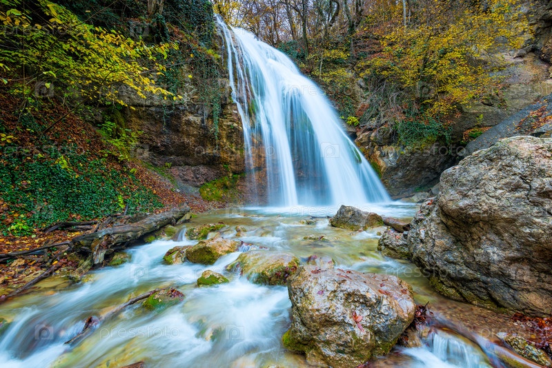 Быстрый полноводный водопад Юр-Юр в горах Крыма, живописная природная достопримечательность осенью, Россия
