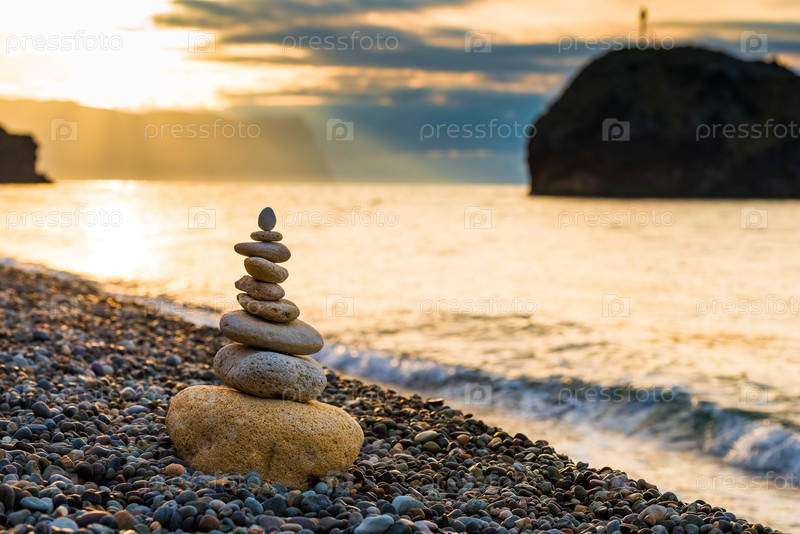 Баланс на рассвете - крупный план пирамиды из белых камней на галечном пляже