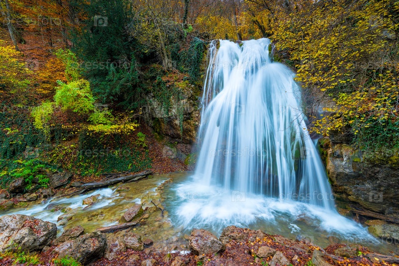 Быстрый полноводный водопад Юр-Юр в горах Крыма, живописная природная достопримечательность осенью, Россия