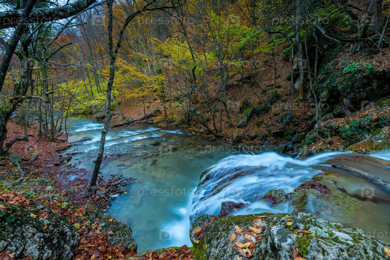 Быстрая река в горах в лесу, осенний пейзаж, природа России