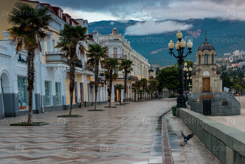 Набережная российского города Ялты осенью днем, вид на город и горы