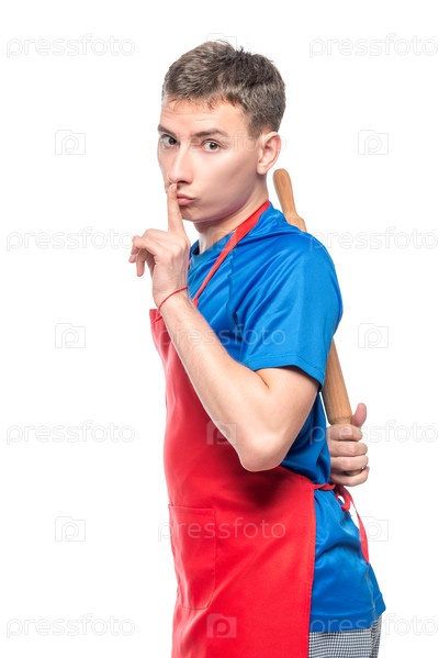 Шеф-повар в фартуке прячет за спиной катящуюся булавку, жест пальцем в губы тише! Портрет изолирован на белом фоне
