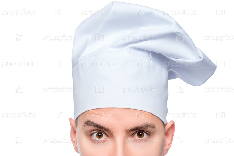 Посмотрите на повара в кепке, глаза закрываются, портрет изолирован на белом фоне
