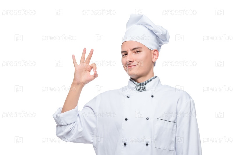 Успешный шеф-повар с жестом руки, портрет на белом фоне изолирован