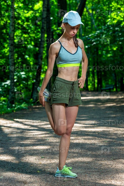 Красивая спортивная девушка разогревает мышцы перед пробежкой в парке