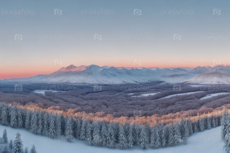 Безмятежный зимний пейзаж, живописная панорама. Генерирующий ИИ