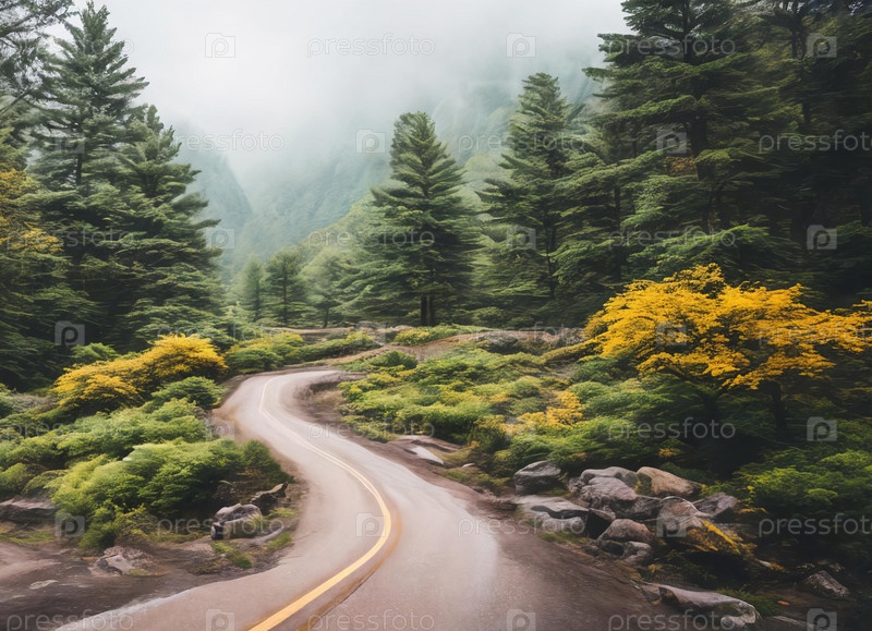 Серпантины сквозь густой туман в высокогорном лесу, таинственные и очаровательные, с деревьями, нависающими как призраки в тумане. Генеративный ИИ