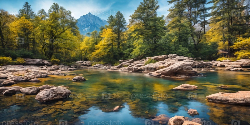 Спокойная горная река отражает возвышающиеся вершины в ясный день, ее спокойные воды отражают красоту величественных пейзажей. Генеративный ИИ