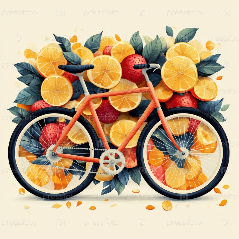 Оранжевый велосипед с цитрусовыми и клубничными фруктами