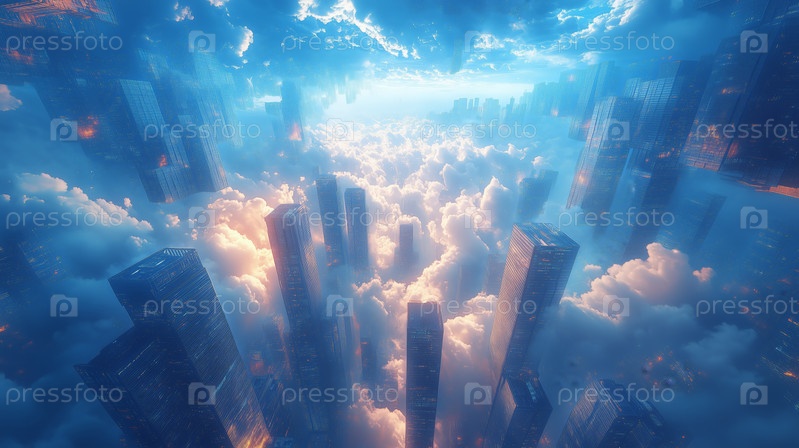 Футуристический городской пейзаж над облаками на закате