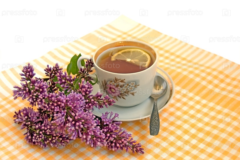 Чай с лимоном и веточка сирени на желтой клетчатой салфетке на белом фоне