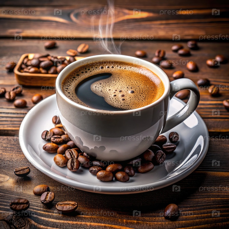 Чашка кофе на тарелке, окруженная кофейными зернами. генерирующий ИИ