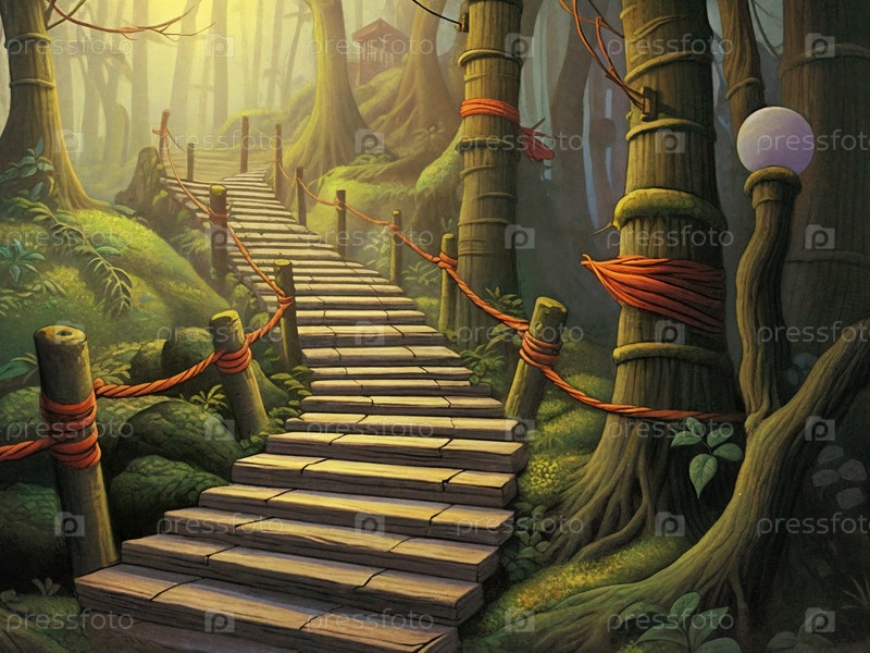 Фантастический лес, лестница на переднем плане. ИИ генеративный