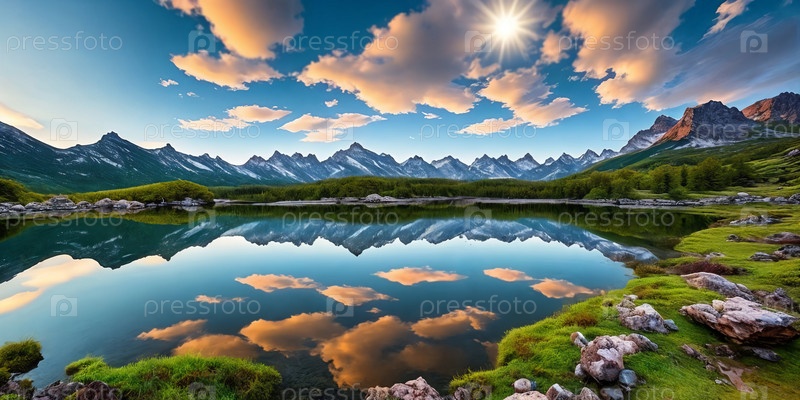 Захватывающая горная долина с спокойным озером, окруженная пышным лесом. Генерирующий ИИ