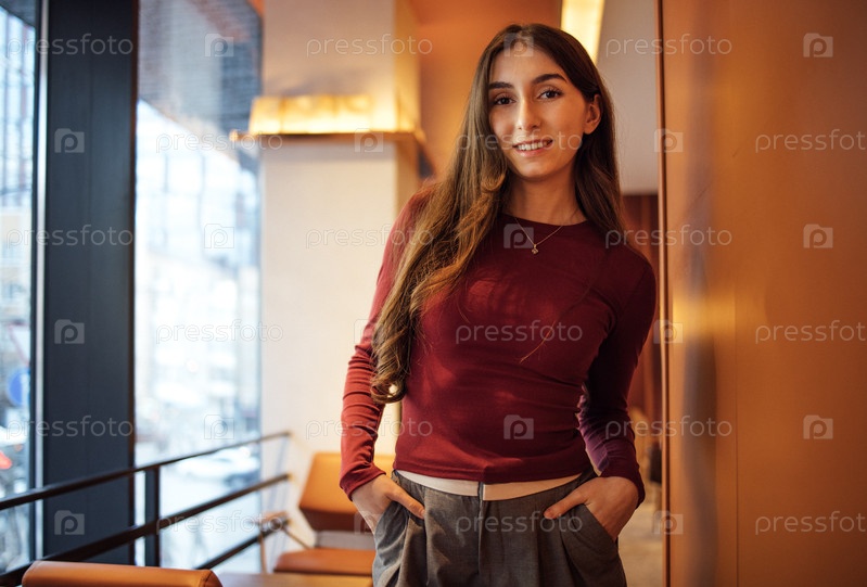 Красивая девушка в бордовом свитере стоит у стены в кафе и улыбается. Подросток в повседневной одежде позирует в ресторане