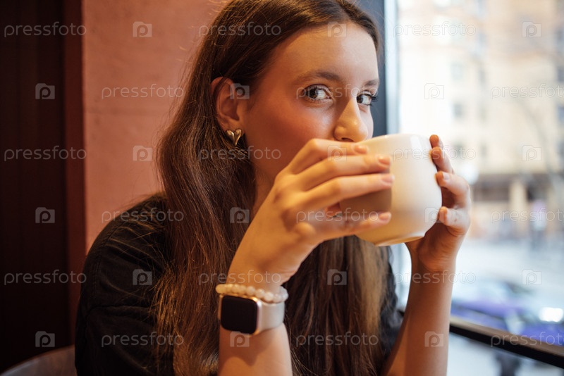 Молодая женщина держит чашку кофе и улыбается в помещении. Очаровательная девушка в футболке