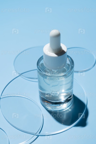 Сыворотка с пипеткой в чашке Петри на синем фоне. Вид сверху, плоская лежа. Дерматологическая наука косметическая лаборатория. Натуральная медицина, косметические исследования, органические средства по уходу за кожей