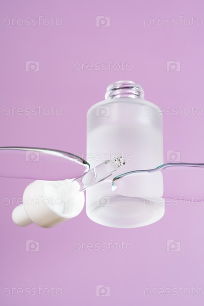 Прозрачная бутылка капельницы с сывороткой ретинола на стеклянной поверхности в пролитой жидкости. Трендовая презентация продукта снизу