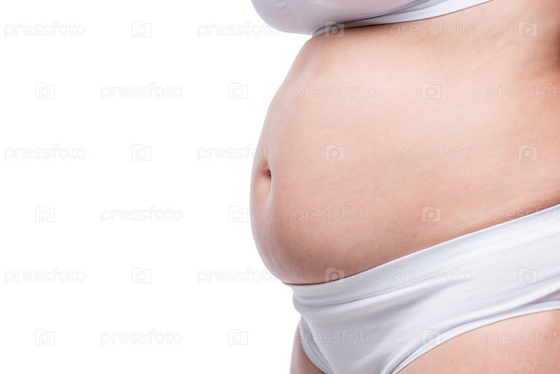Изолированный жирный живот женщины в нижнем белье на белом фоне