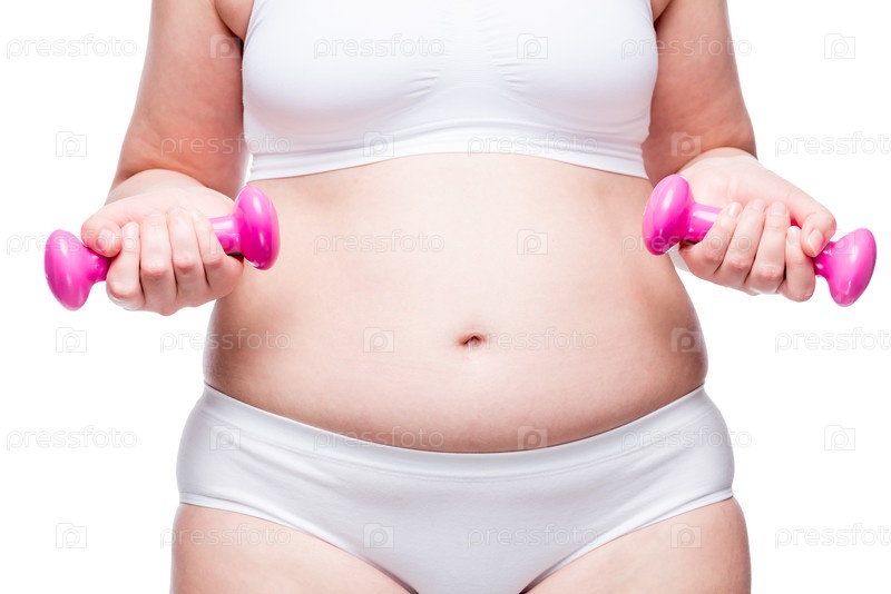 Готовность к потере веса. Женщина с толстым животом держит в руках гантели